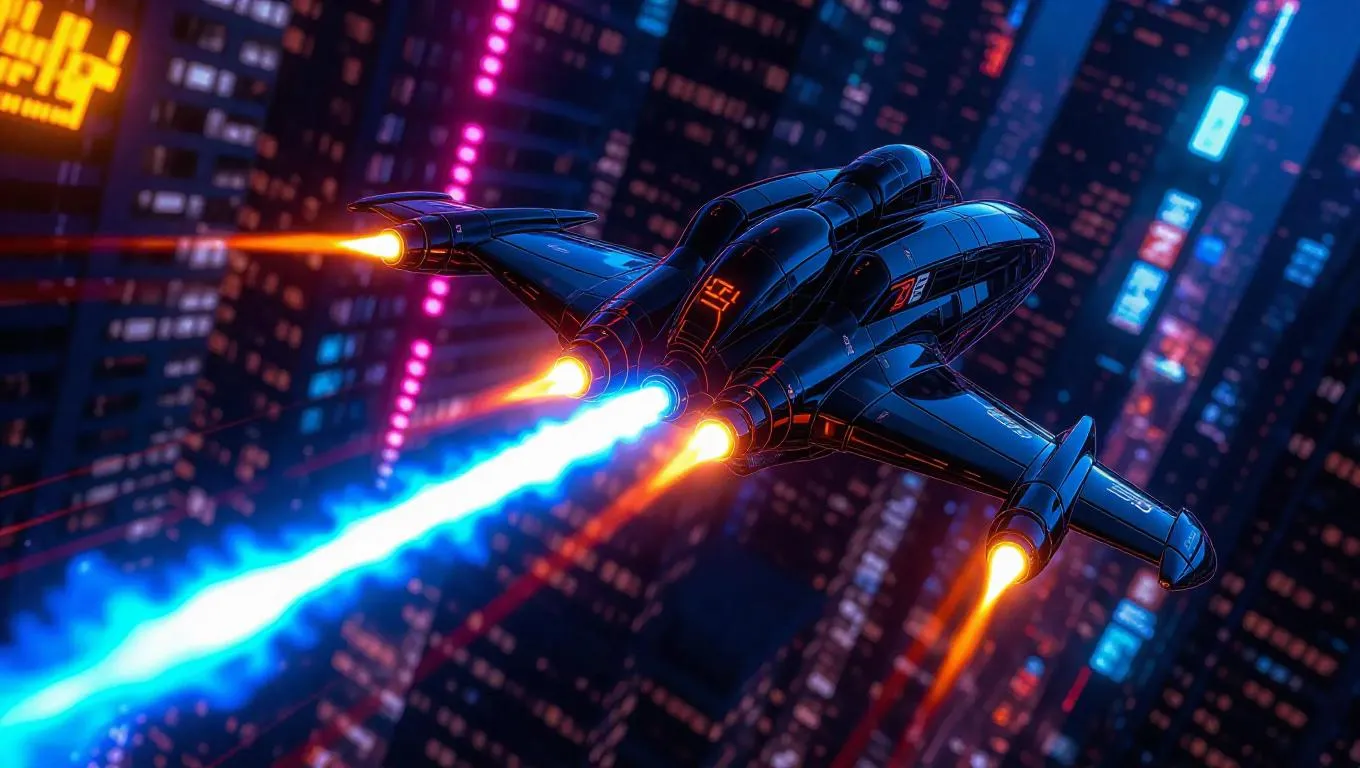 Blazing jetpack flying racing team, soaring through a neon-lit cityscape, trails of electric blue and orange flames, futuristic skyscrapers, dynamic motion blur, intense competition, high-speed aerial stunts, sleek suits, and a sense of adrenaline and adventure.