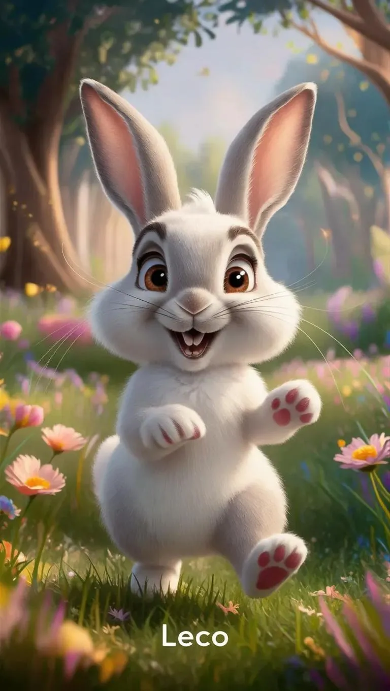 Create a charming 3D Pixar-style animation of Leco, an energetic white rabbit with soft fur and curious eyes, leaping through a vibrant floral field. AI-generated art captures his playful-to-thoughtful transformation in a magical atmosphere. Explore vivago.ai's text-to-image tools for lively character design and vivid 3D scenes blending whimsy and serenity.