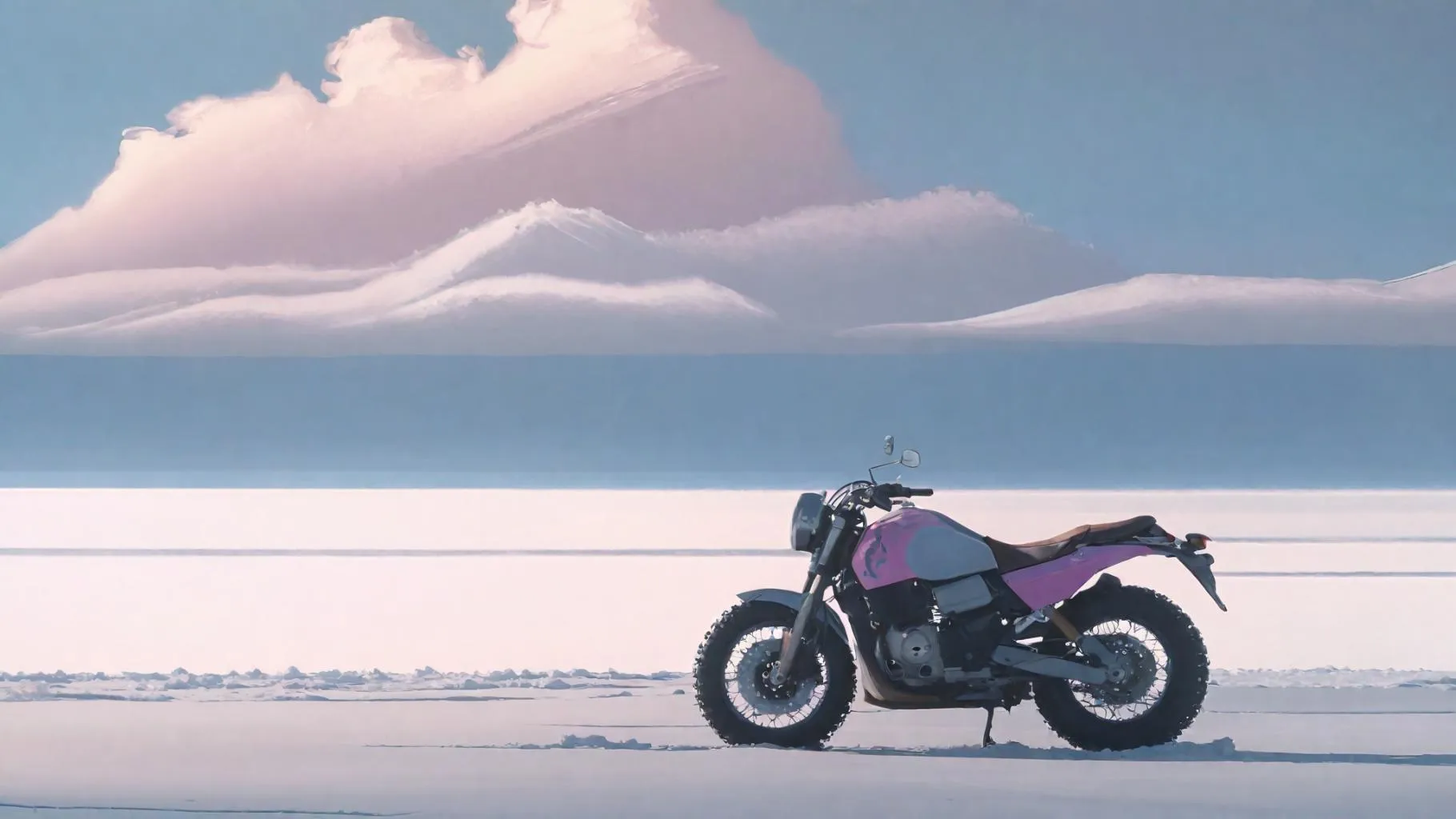 Explore AI-generated visuals of a sleek motorcycle on a vast icy plain, contrasting metallic sheen against pristine white. Dusk's pink-blue gradient sky enhances solitude and adventure. Features robust design, sturdy wheels, poised for frozen expeditions. Create striking, high-quality AI imagery blending nature's serenity with futuristic exploration.