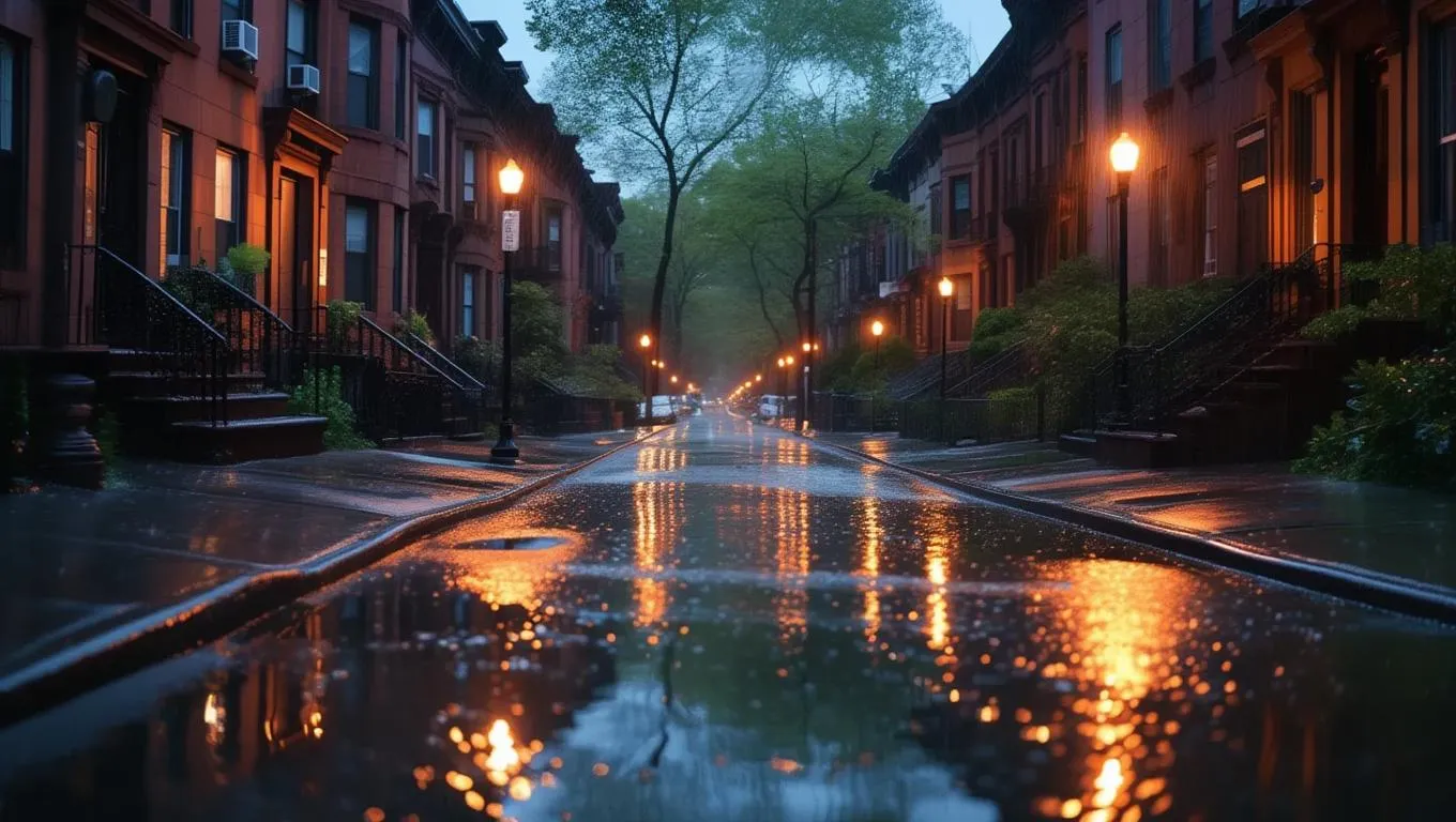 Capture the eerie charm of a rainy NYC suburban street with AI. Gloomy brownstones, reflective puddles under flickering streetlamps, and storm-soaked cracked sidewalks reimagined through AI artistry. Perfect moody urban landscapes blending nostalgia and atmospheric tension for filmmakers, game designers, and digital creators seeking hauntingly beautiful rainy night visuals.