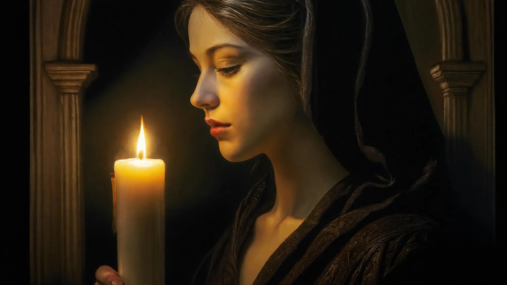 Create AI-generated Renaissance-style paintings with dramatic chiaroscuro lighting. Design a woman holding a candle in a dark chapel for book cover art using Vivago.ai's AI image tools. Transform text prompts into professional-grade visuals with curated effects and editing features.