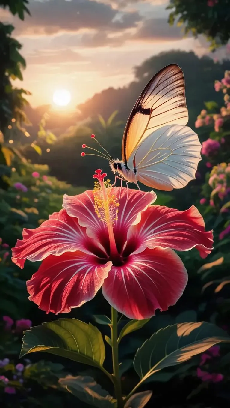Create stunning AI-generated art with a vibrant red hibiscus flower, adorned by a large white butterfly, in a magical garden at sunset. Ultra HD details capture intricate textures, golden-hour lighting, and enchanting nature elements. Perfect for high-quality visuals, digital art projects, or surreal landscape inspiration using Vivago.ai's advanced image generation tools.