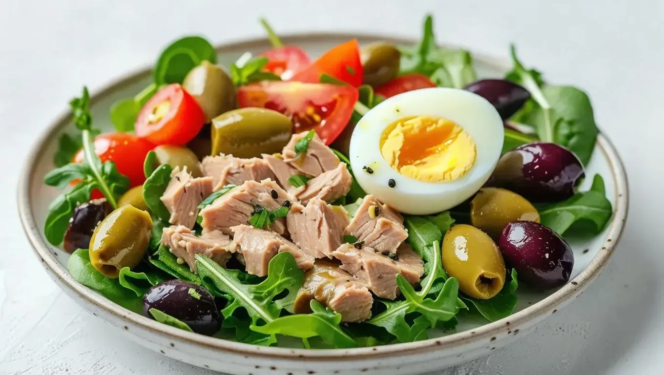 Create a vibrant canned tuna salad with olives and boiled eggs using AI-generated visuals. Perfect for meal prep, this protein-packed, Mediterranean-inspired dish shines on a clean white background. Ideal for food blogs, recipe sites, or health-conscious content seeking fresh, balanced, and visually appealing meal ideas with easy customization options.