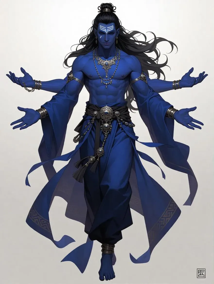 Generate AI-powered ultra-high resolution art of an exotic dark blue-skinned man with four arms, intricate facial markings, flowing black hair, and mystic robes. Hand-drawn realism meets digital precision in this striking character portrait against a subtle grey backdrop. Elevate your creative projects with VivaGo.ai's professional-grade image generation tools for fantasy-inspired, detail-rich visual storytelling.