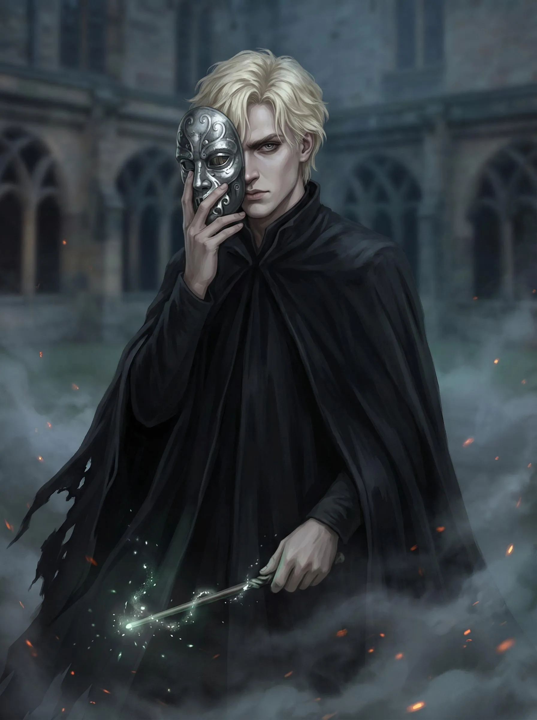 Generate stunning AI art of Draco Malfoy at Hogwarts: canon-accurate, 18-year-old Death Eater. Featuring dramatic half-mask, piercing gaze, flowing tattered cloak, and wand emitting magical sparks. Cinematic, highly detailed digital painting in epic concept art style. Atmospheric mist, Magali Villeneuve/Artgerm inspiration. Create this imposing visual with Vivago.ai's AI image generator.
