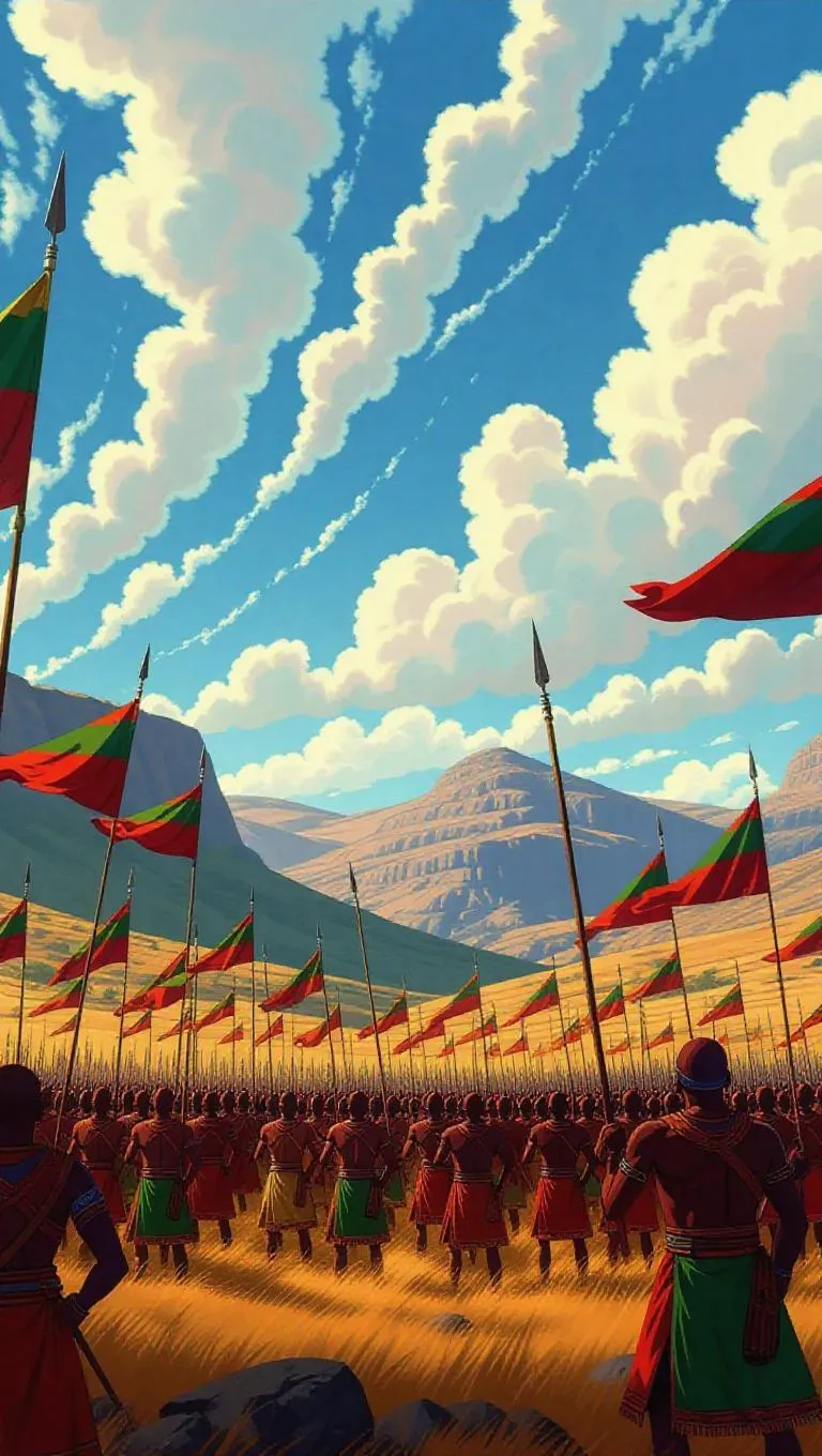 Generate a vibrant AI cartoon scene of Ethiopian warriors in traditional attire, wielding spears and rifles on a vast highland. Vivago.ai crafts dynamic, diverse battle-ready crowds with professional AI image tools for stunning visual storytelling.