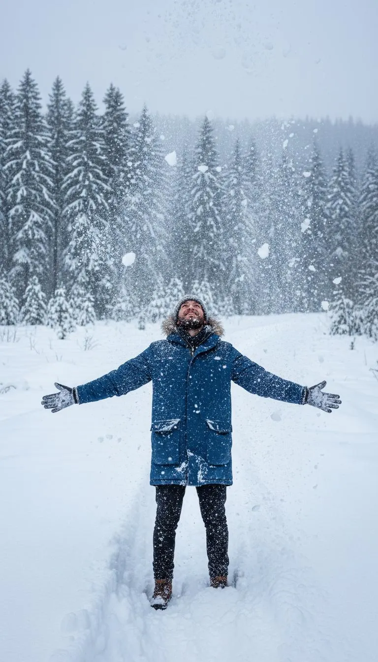 Generate stunning AI visuals of a man enjoying peaceful snowfall. Create captivating winter scenes effortlessly with vivago.ai's image generator. Transform your text prompt into a serene snowy landscape featuring a figure embracing the weather.