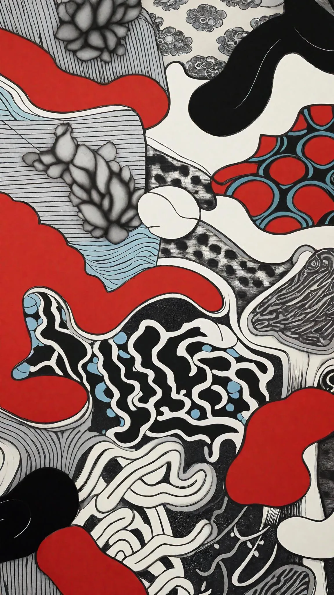Psychedelic, vivid red, black, gray, and white hues, intricate Japan ornate topography, ancient scripts, and timeless images of feudal Japan, blending traditional art with surreal patterns.
