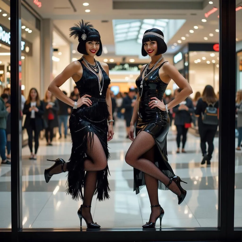 Transform text into cinematic realism with vivago.ai's AI image generation. Create striking vintage scenes like two stylish 1920s flapper girls posing mid-dance behind a modern mall window. Bold makeup, fringed dresses, neon reflections captivate curious passersby. Achieve high-end lighting and sharp, cinematic detail effortlessly.