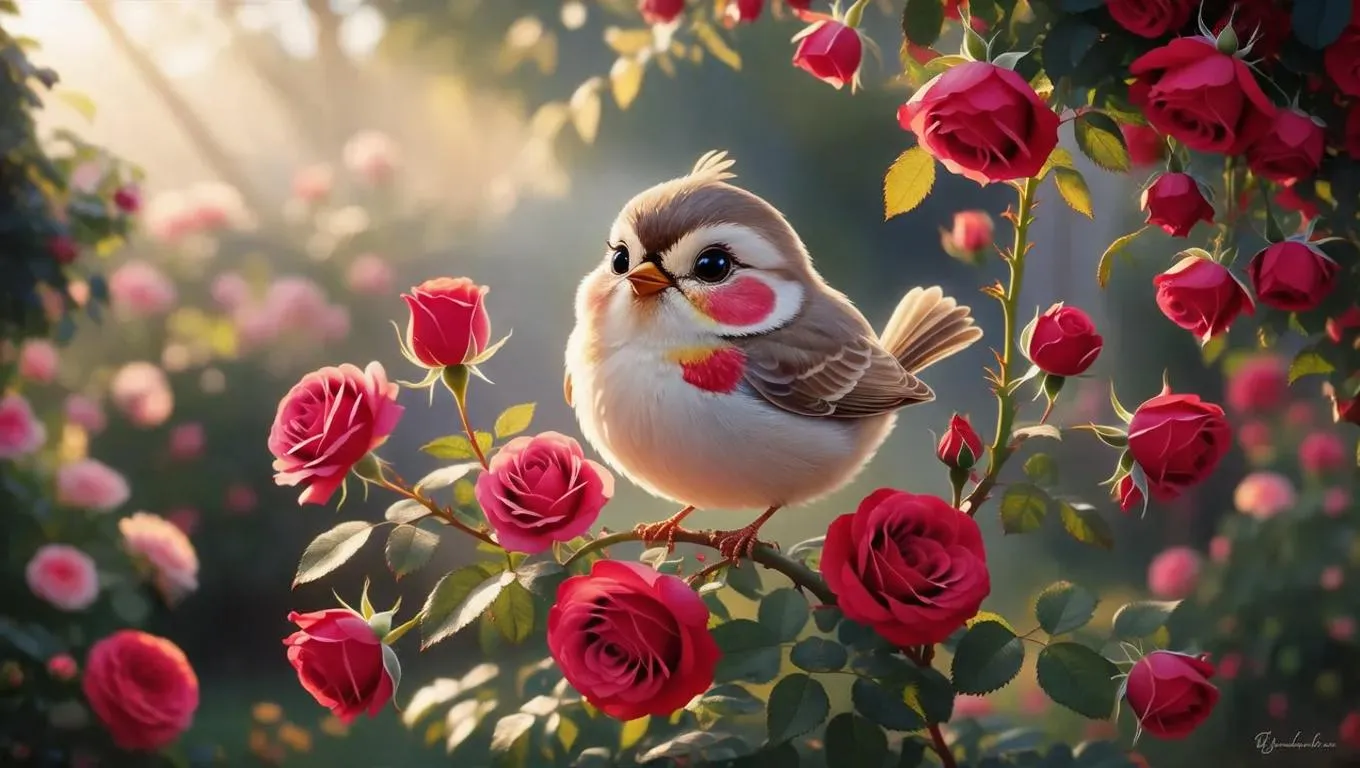 Create charming AI-generated art of a cute bird surrounded by roses. Transform text prompts into vibrant paintings with Vivago.ai's creative tools for professional-grade visual storytelling and stunning imagery.