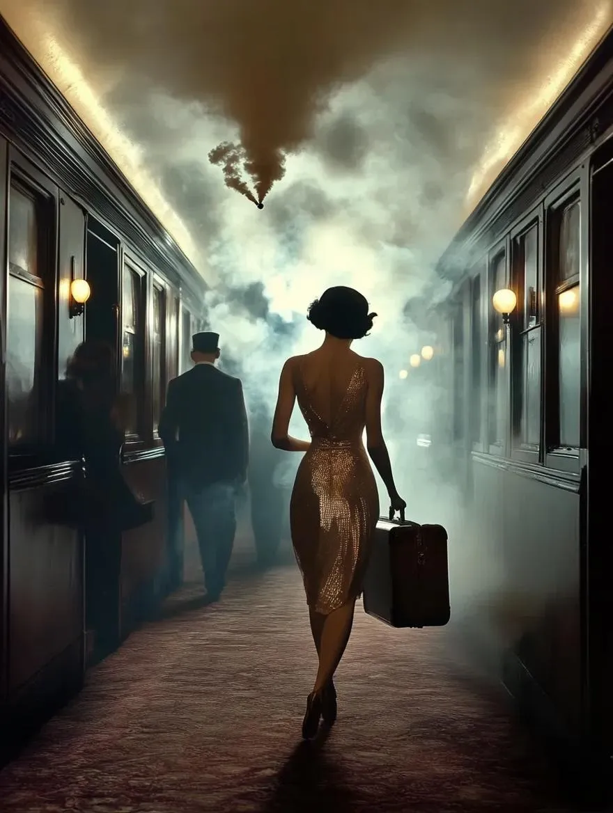 Step into a 1930s dark train corridor with AI-generated imagery: a luminous lady in a shimmering dress glides past gentlemen's smoke, her dancing coat trailing. Vintage luggage, ornate carpets, and low-light drama evoke film noir elegance. Capture this chic, atmospheric scene with VivaGo.ai's tools for cinematic AI visuals blending mystery and retro allure.