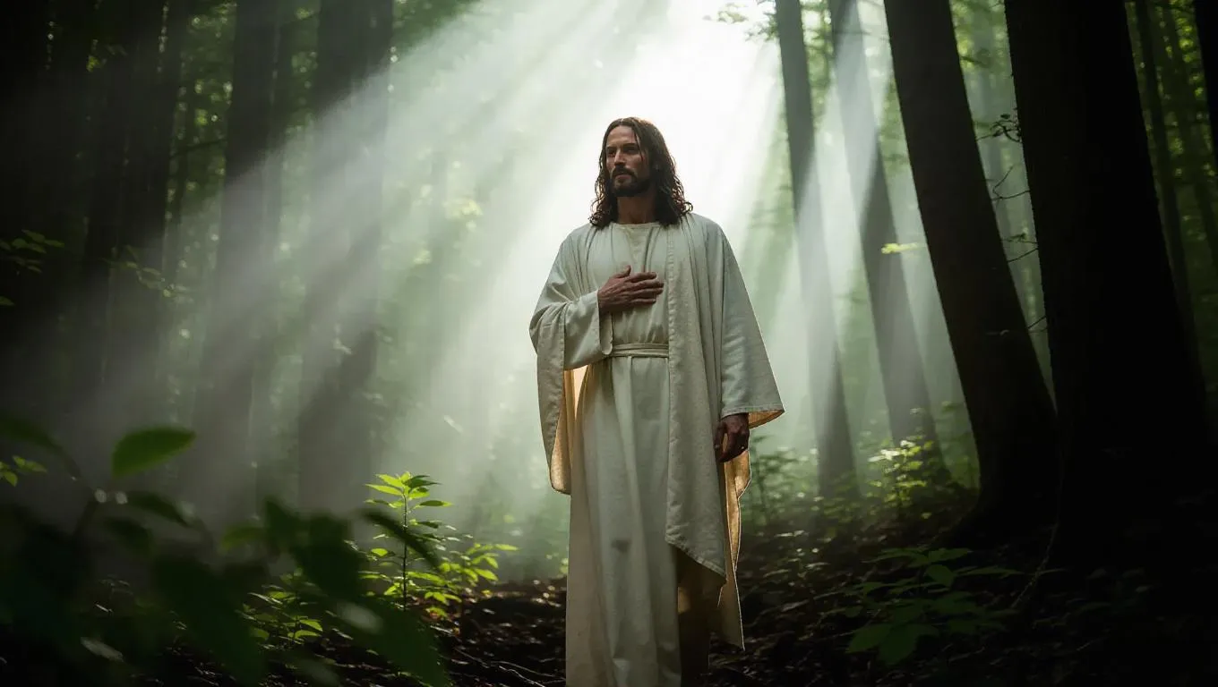 Generate a dramatic AI image/video of an injured Jesus in a mystical forest, blending religious symbolism with natural wilderness. Perfect for biblical storytelling, digital art projects, or spiritual content creation using Vivago.ai's AI effects and text-to-visual tools for striking, emotionally charged imagery.