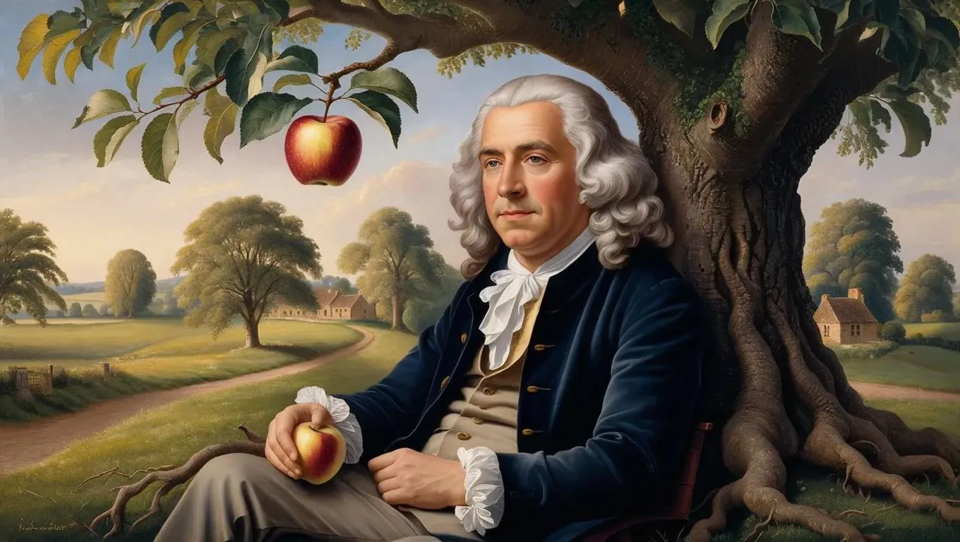 Generate a vivid AI-powered image of Isaac Newton beneath an apple tree, depicting the legendary gravity discovery moment. Ideal for educational resources, scientific visuals, and historical AI art. Enhance projects with professional-grade physics-inspired imagery using cutting-edge creative tools.