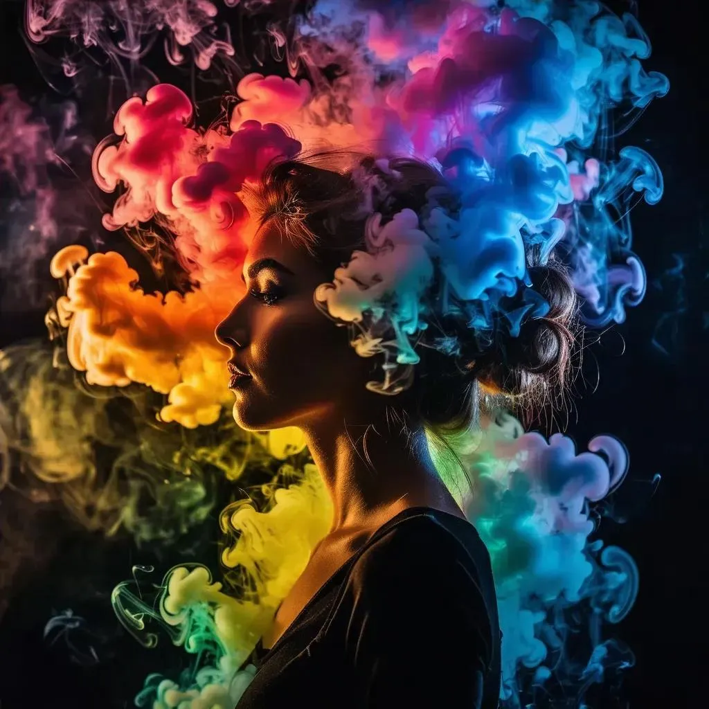 Discover surreal AI art with vivago.ai: vibrant rainbow-colored smoke exhaled from a woman's side profile, contrasting dramatically against a black backdrop. Transform text prompts into striking visuals using advanced AI tools for surreal, professional-grade imagery. Explore creative AI effects for dynamic, vivid, and imaginative digital masterpieces.