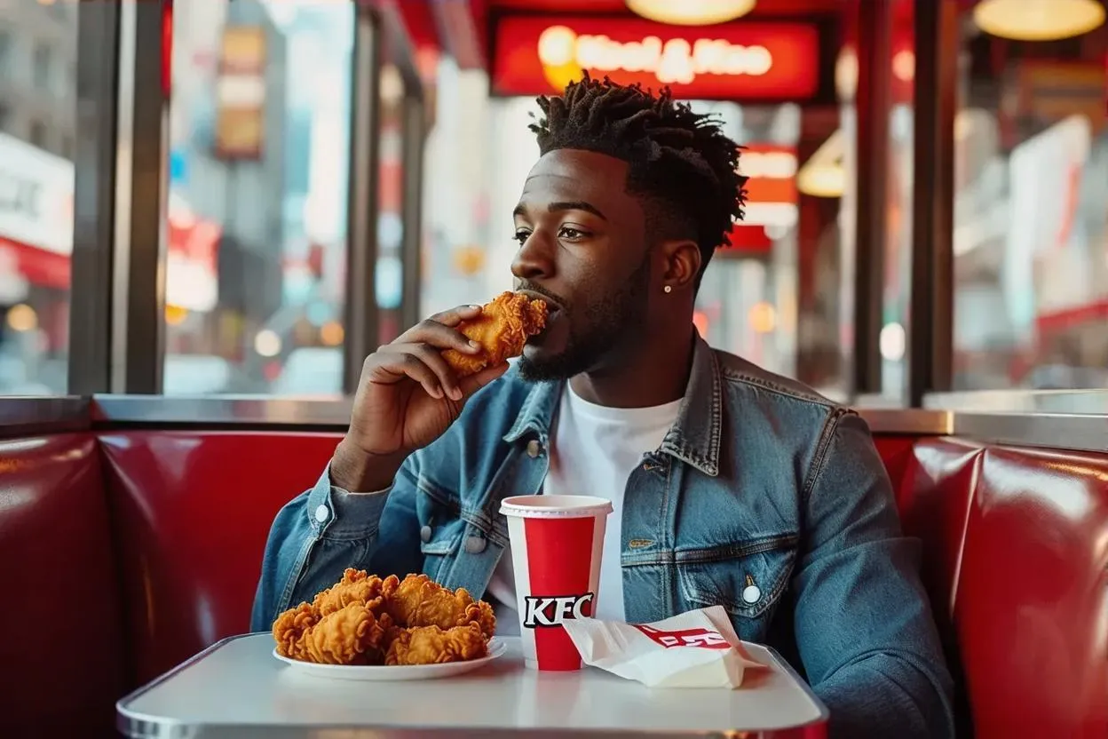 Generate vibrant AI visuals of a man enjoying KFC chicken strips and Kool-Aid. Perfect for casual dining scenes, African American culture, or fast food marketing. Use vivago.ai's AI effects for lifelike details.