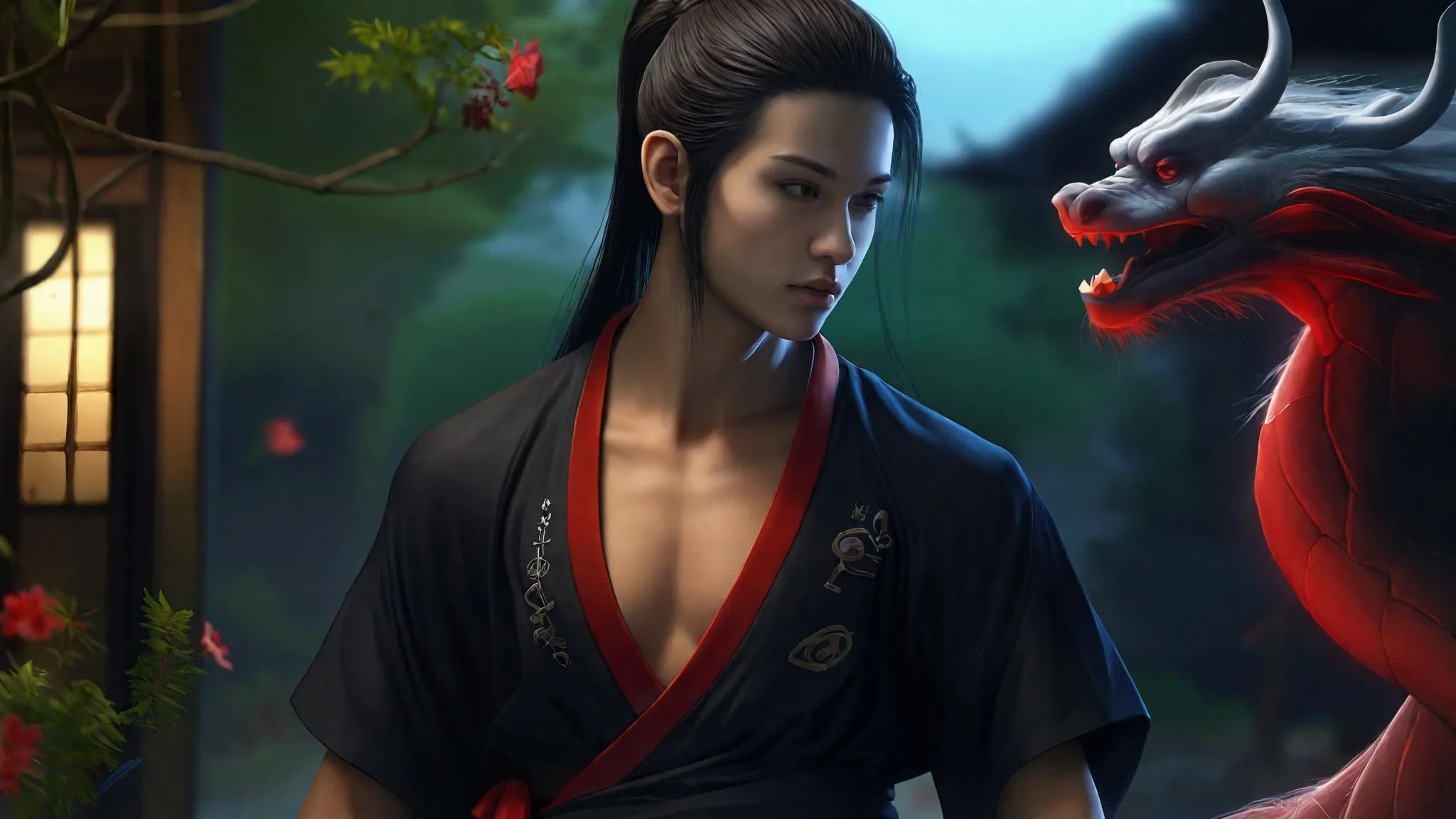 Generate a realistic 3D cartoon of a Hmong man in black attire with blue cuffs and red waist sash, showcasing shiny wavy hair. Angry expression, silky textures, and stormy night forest setting with a trailing tiger, banana trees, bamboo, and windswept dark sky for dramatic immersion.