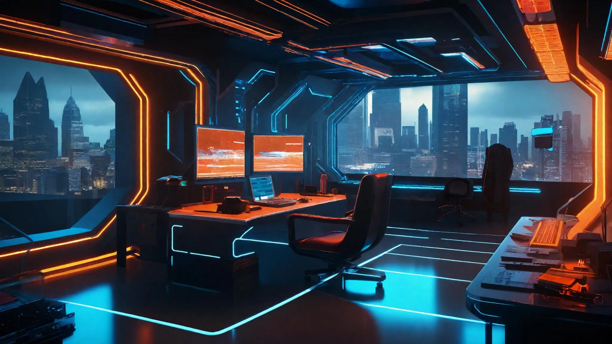 Futuristic neon-lit studio with steel walls, orange-blue ambiance, and abandoned high-tech vibes. Explore AI-generated visuals of a modern, deserted workspace with cityscape views, advanced tech tools, and vibrant neon aesthetics. Perfect for relaxation lab themes, producer studio inspiration, or sci-fi creative projects. Transform prompts into vivid, professional-grade imagery with Vivago.ai's AI effects and cutting-edge design tools.