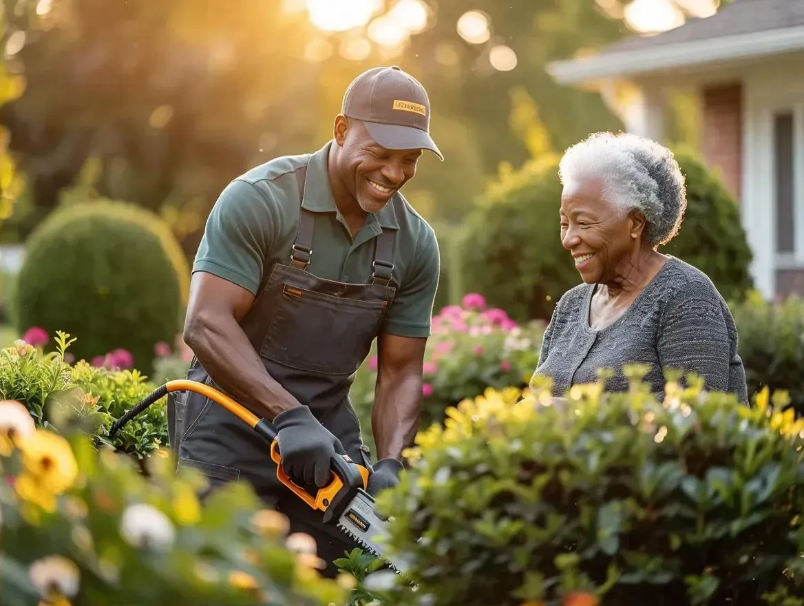 Generate heartwarming AI images of African American landscapers trimming hedges alongside smiling elderly observers. Create inclusive, intergenerational scenes with VivaGo's AI tools for authentic diversity in landscaping visuals, community bonds, and professional-grade editing. Perfect for crafting relatable, uplifting content with cultural representation.