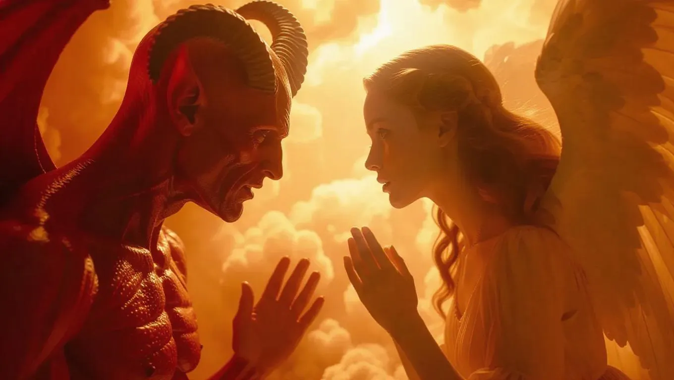A diabolical devil and a serene angel engage in a cryptic conversation, hovering amidst swirling, iridescent cloud formations that resemble cauliflower blooms, as warm, golden light seeps through the gaps, casting an ethereal glow. The devil's crimson skin glistens with dew, his horns twisting upward like ram's horns, while the angel's porcelain complexion radiates an aura of purity, her wings unfolding like a lotus flower. Soft, feathery cirrus clouds waft by, as if blown by an unseen breeze, in a surreal, high-contrast scene that embodies the essence of a magazine cover, with an airbrushed, hyper-realistic finish, reminiscent of a fantastical dreamscape.