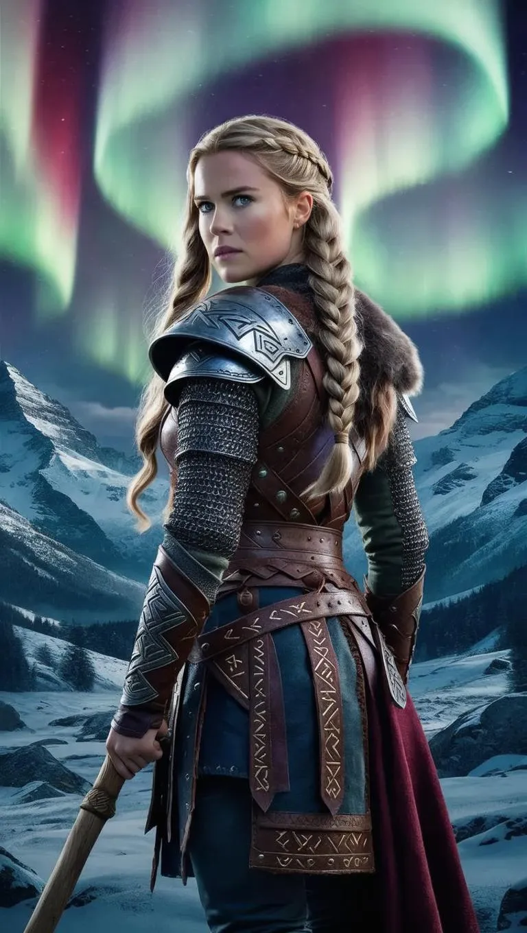 Generate epic Viking warrior AI art with Valhalla themes. Craft strong Nordic female characters in mystical landscapes featuring northern lights, snow-capped mountains, and rune-adorned armor. Perfect for fantasy visuals, ancient power scenes, and Norse mythology-inspired designs using advanced AI image generation tools for professional-grade results.