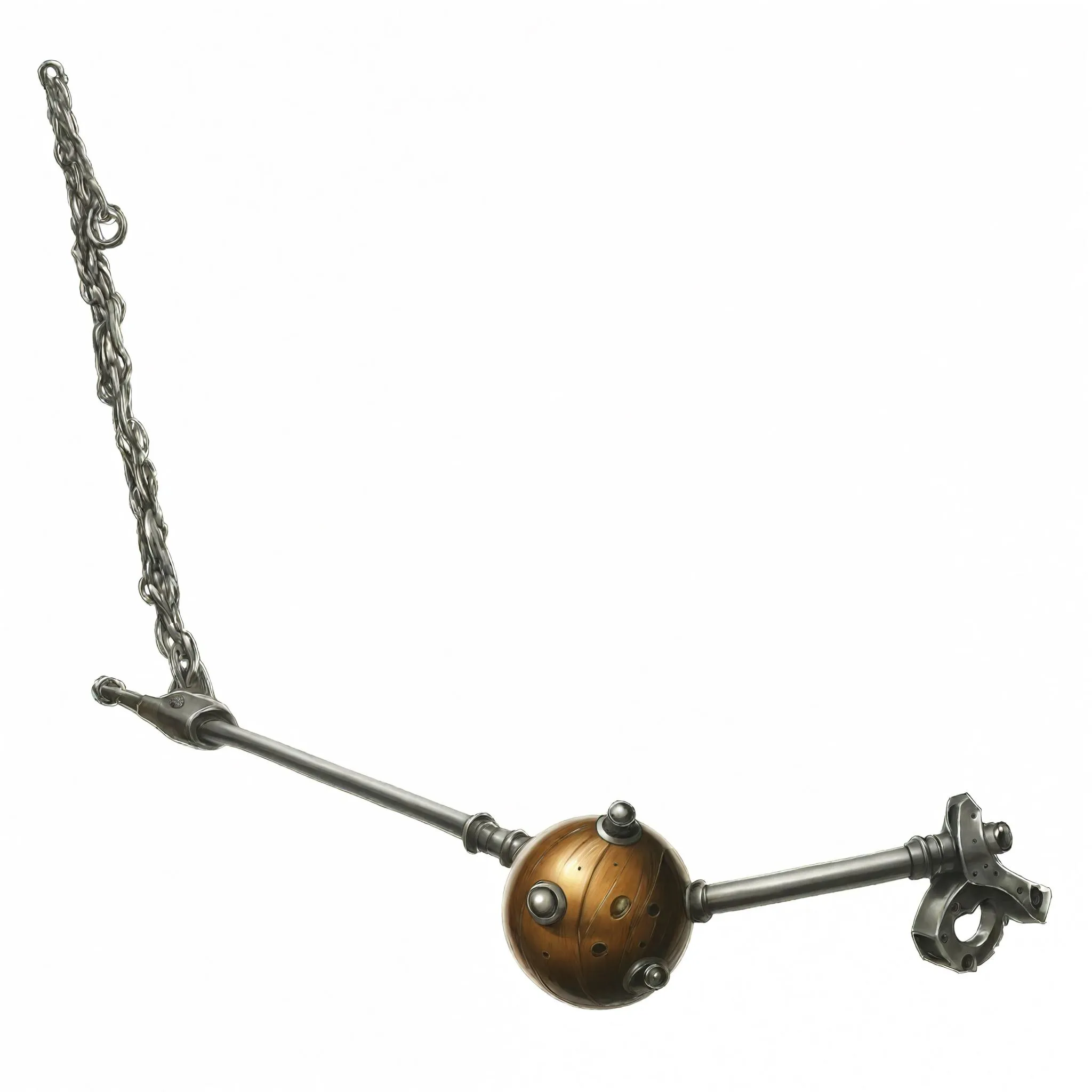 Generate a striking fantasy weapon design with AI: a steel ball chained to a stick, rendered in detailed hand-drawn style. Realistic textures, dynamic composition, and clean white background highlight this mystical armament. Perfect for RPG art, concept design, or dark fantasy visuals. Create unique AI-powered illustrations with precise prompts and professional-grade rendering tools.