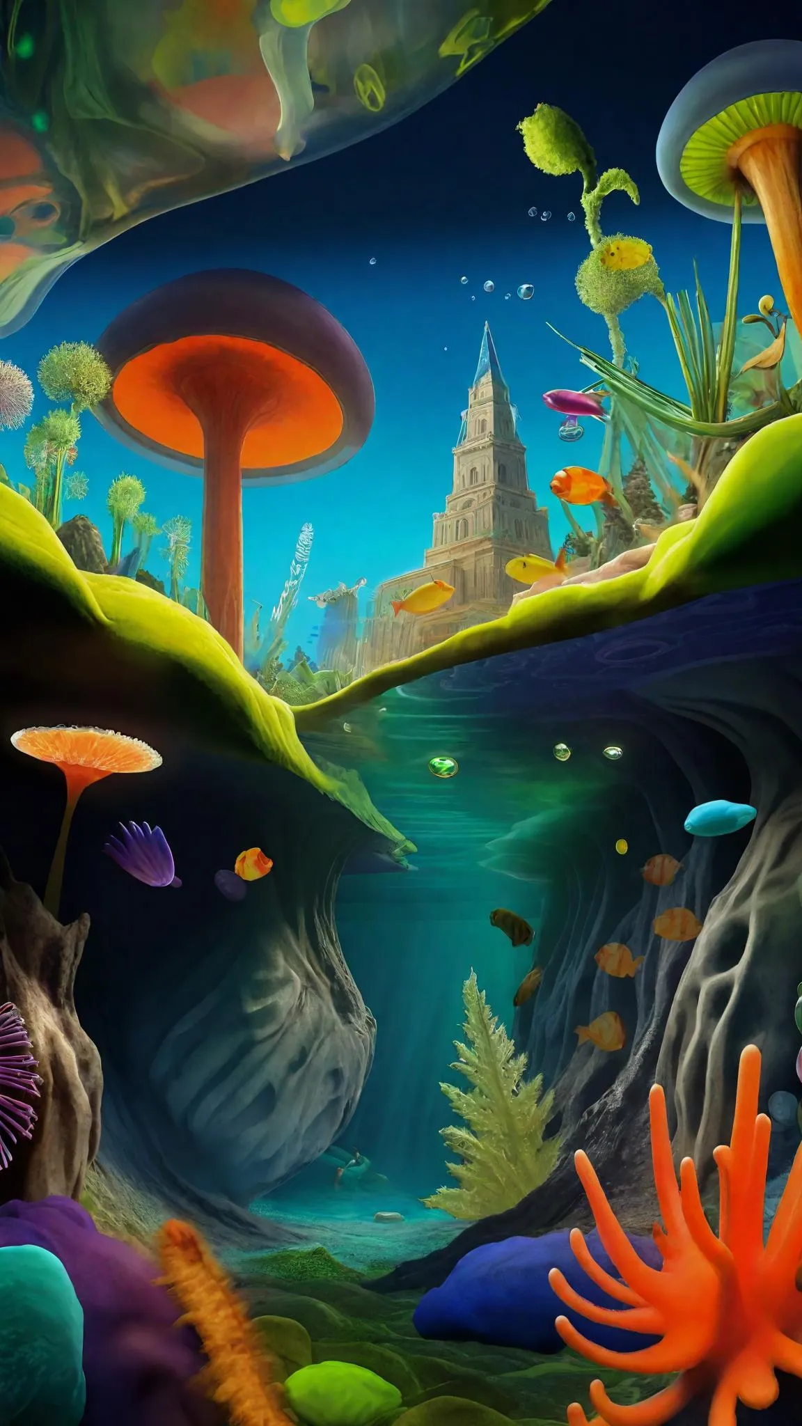 Dive into a mesmerizing AI-generated Cretaceous underwater cityscape, where Eric Carle-inspired psychedelic creatures roam submerged streets. Explore crystal-clear green-blue waters, natural rock formations, and vibrant coral ecosystems through unique submerged camera angles. Create fantastical aquatic worlds with Vivago.ai's advanced AI image tools for surreal, professionally crafted underwater scenes blending prehistoric charm with whimsical visual storytelling.