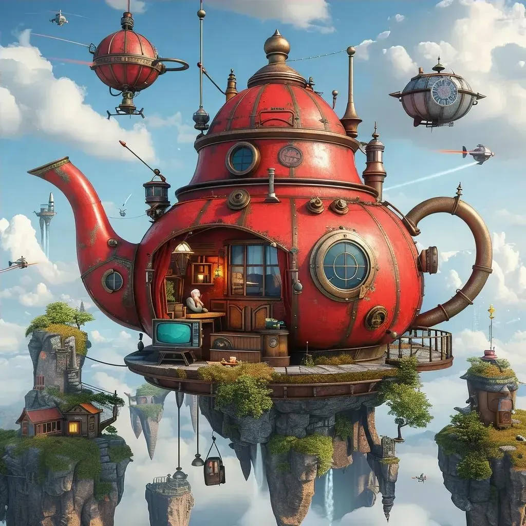 Surreal AI-generated fantasy art of a steampunk teapot house with red exterior and cozy interior. Features elderly man relaxing amid retro tech, floating islands, and whimsical details like porthole windows, flying machines, and cutaway views. Vibrant colors, soft lighting, and intricate game interface elements create a dreamlike, otherworldly atmosphere with an observation deck and weather vane.