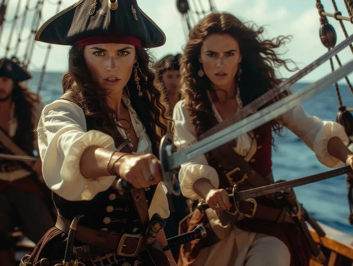 Generate AI-powered visuals of Mary Read and Ann Bonny, fierce pirate women in a thrilling boarding attack scene. Transform text prompts into professional-grade historical pirate imagery with Vivago.ai's AI effects and editing tools. Create dynamic action scenes with legendary female pirates using cutting-edge AI image generation.