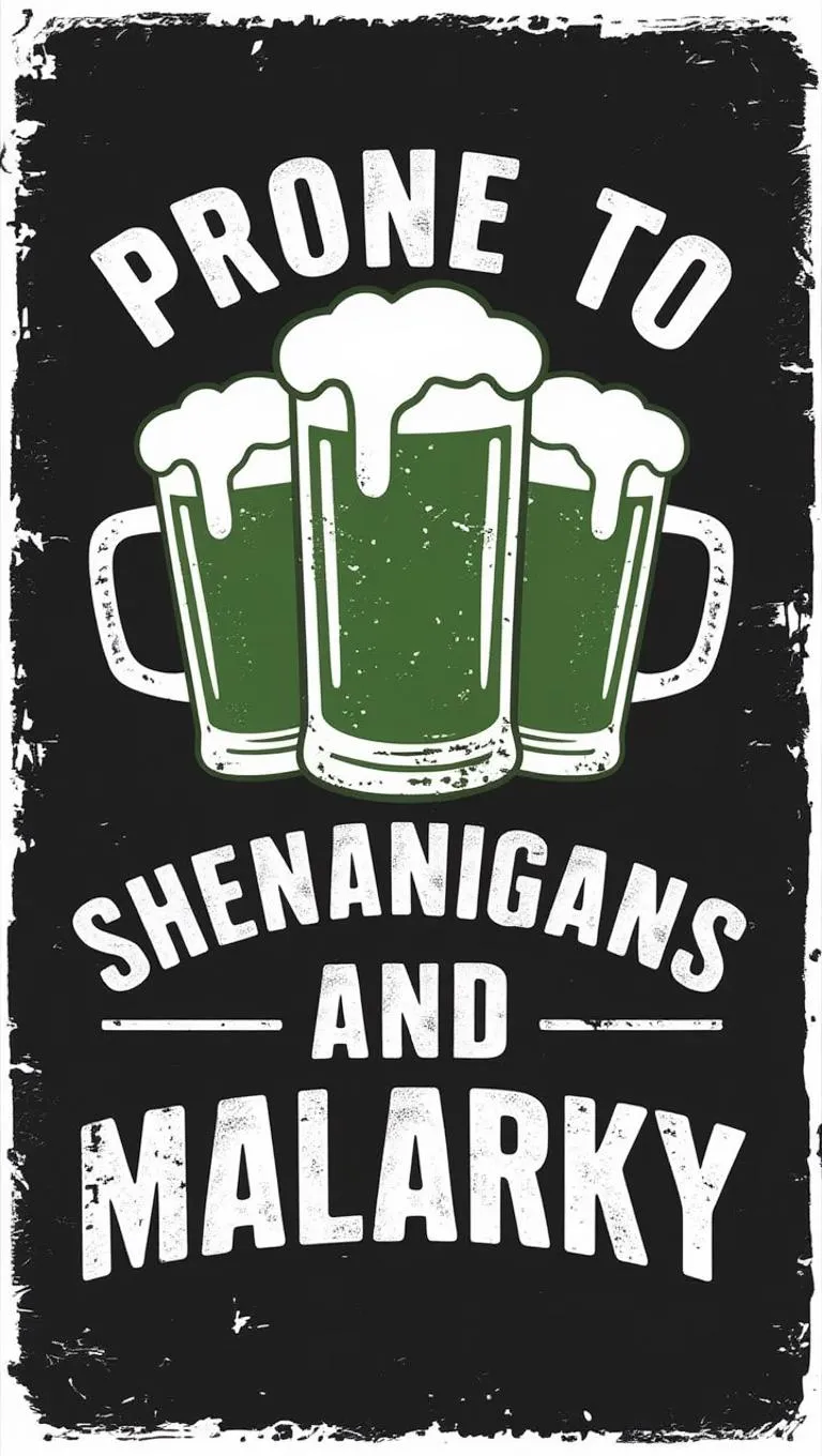 Create a bold vintage design with distressed white text reading "PRONE TO," "SHENANIGANS," and "& MALARKY" around frothy green beer mugs. Features retro distressed textures, curved/straight typography, and dark black background for nostalgic, geeky appeal. Perfect for fun-loving audiences seeking eye-catching retro-themed graphics with dynamic AI-generated beer illustrations.