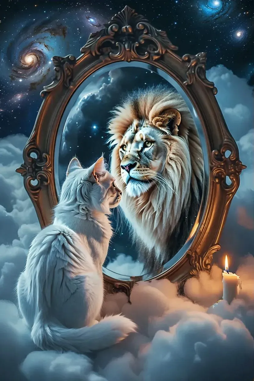 Craft a surreal cosmic scene with AI: a white cat gazes into an ornate mirror reflecting a majestic lion, set against a vibrant nebula galaxy. Intricate details, eerie ambiance, and celestial elements create immersive, professional-grade visuals.