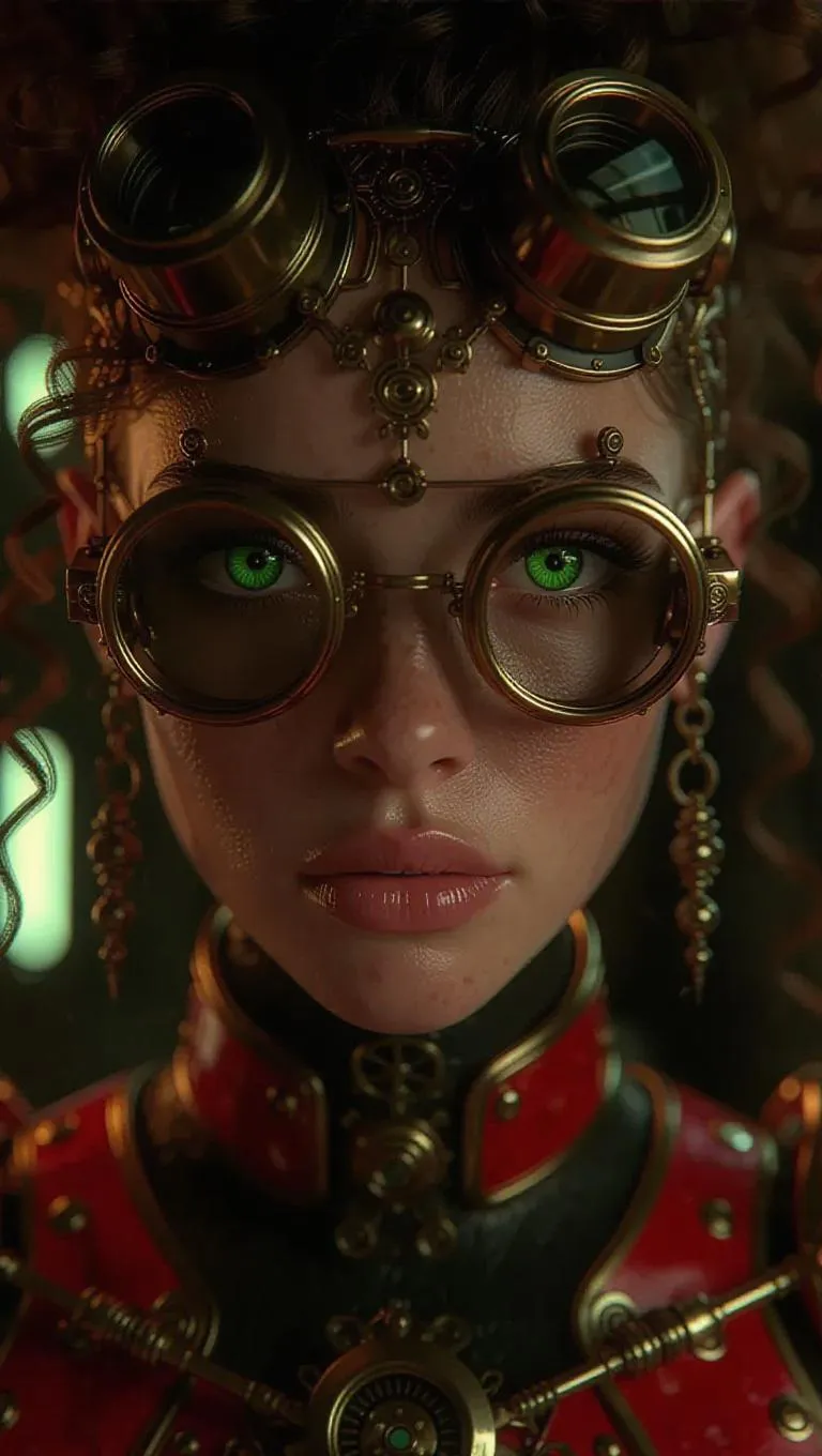 Craft hyper-realistic Steampunk portraits with AI: futuristic goggles, intricate machinery, green eyes, and ornate gold-red cyberpunk aesthetics. Generate ultra-detailed 3D renders, cinematic lighting, and lifelike textures for sci-fi art. Perfect AI image generator for steampunk concept designs, ultra-HD resolution, and professional-grade digital masterpieces. Transform prompts into top-quality visuals instantly with VivaGo.ai.