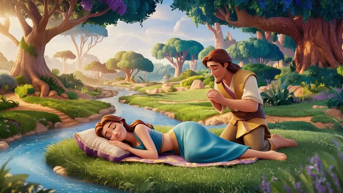 Create Disney-style AI art of Adam and Eve in a serene Garden of Eden paradise. Vibrant Pixar-inspired cartoon visuals, lush greenery, soft light, and harmonious atmosphere. Perfect for generating tranquil biblical scenes with innocent, pure characters in a whimsical, animated aesthetic. Ideal for AI image creation in #Pixar, #Cartoon, or #Disney-Style themes.