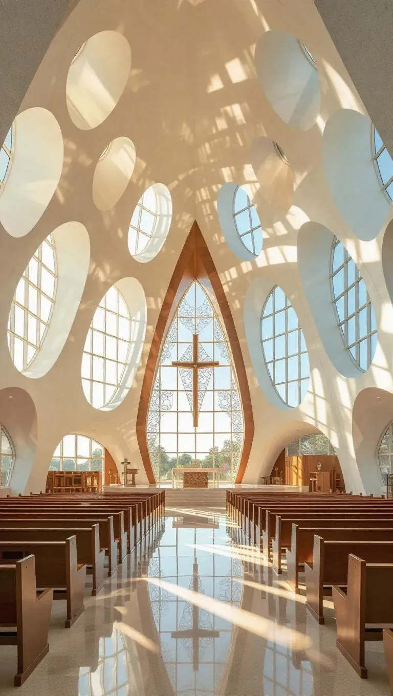Discover a futuristic architectural marvel where the shifting church design morphs from needle to shell-like forms as you explore. Sunlight streams through curved glass panels, casting ethereal light displays in the minimalist prayer hall. A decade-old masterpiece, its immaculate, ahead-of-its-time structure remains a transformative, futuristic icon—inviting endless discovery through evolving angles and visionary aesthetics.