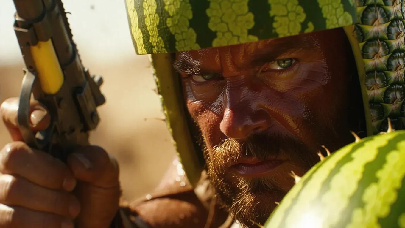 Transform text into vivid AI art of a seasoned warrior in a watermelon helmet wielding fruit weapons: banana rifle, pineapple grenade, lemon shield. Craft dramatic close-ups with warm sunlight, sweat-slick skin, and battle-scarred landscapes using vivago.ai's curated AI effects for dynamic, professional-grade imagery.
