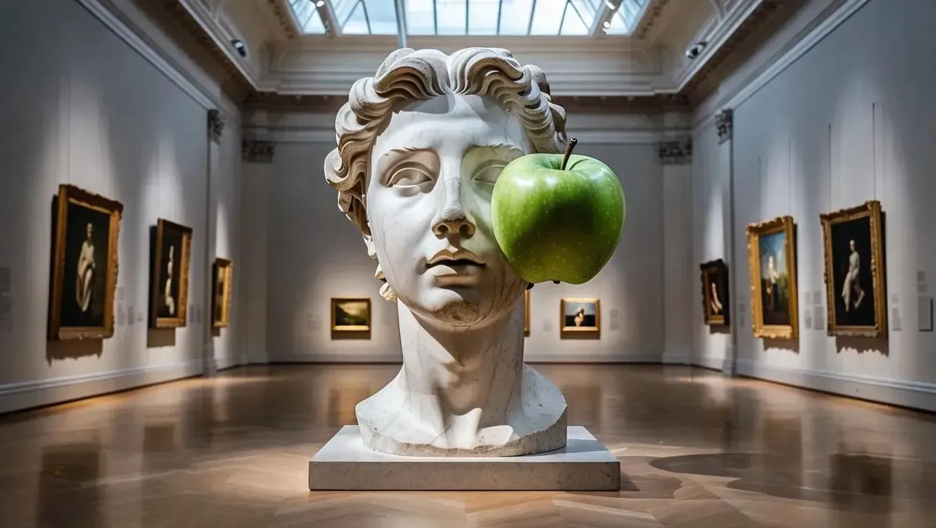 Create a captivating AI-generated art scene: a white statue in a spotlighted gallery, a green apple mid-fall blocking its face. Perfect for surreal visual storytelling and professional projects. Transform text prompts into striking imagery with VivaGo.ai's advanced AI tools for dynamic, high-quality creative results.
