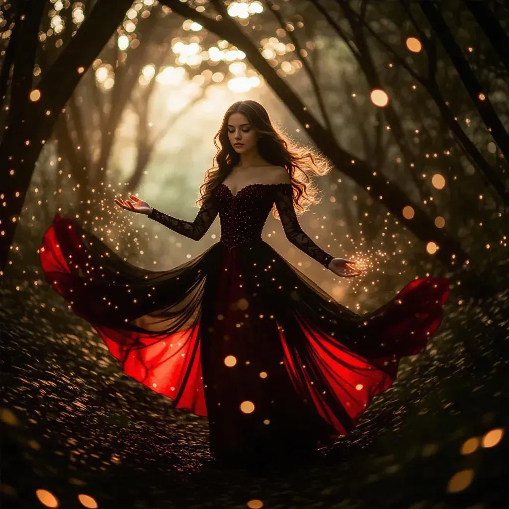 Create AI-generated art of a mystical teen sorceress in a dramatic black-red dress, surrounded by shimmering energy particles within an enchanted forest. Vivago.ai transforms prompts into ethereal visuals with glowing flora, magical auras, and professional-grade AI effects for captivating fantasy scenes. Elevate your storytelling with AI-powered image generation and mystical ambiance tools.