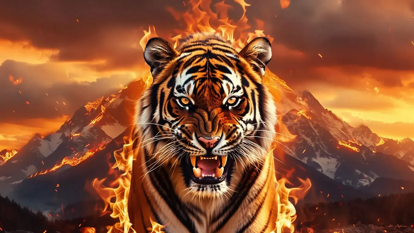 Create striking AI-generated roaring tiger imagery with intense fire effects. Red-eyed tiger amid blazing mountain backdrop, dynamic flames erupting from its mouth, swirling powerfully overhead. Ideal for dramatic wildlife visuals, fiery creature art, and vivid AI-powered scenes. Craft captivating, high-impact designs with Vivago.ai's advanced creative tools.