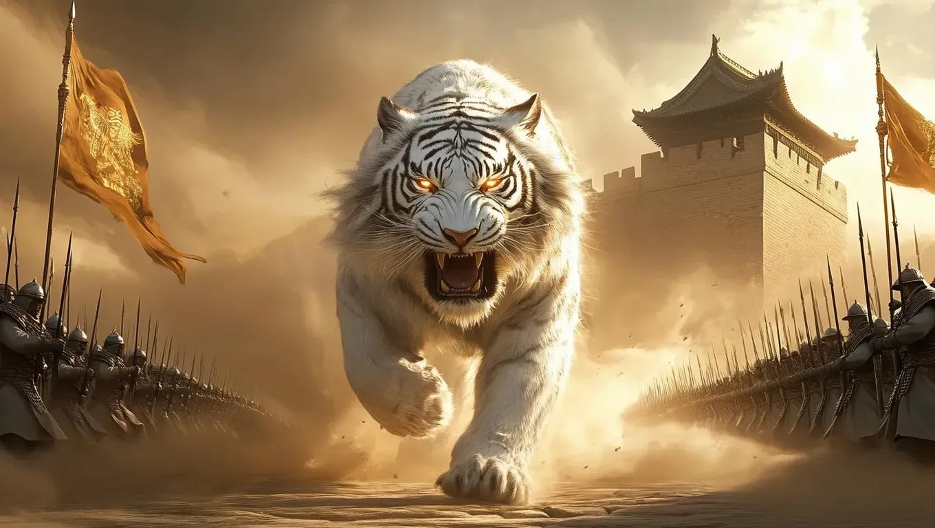 Create AI-generated Chinese-style art of a majestic silver-armored white tiger emerging from a sandstorm near a Great Wall fortress. Dynamic scene features glowing eyes, energy pulses, swirling war banners, soldiers, and golden sunlight. Use VivaGo.ai's AI tools for professional-grade mythical warrior imagery with vivid details.