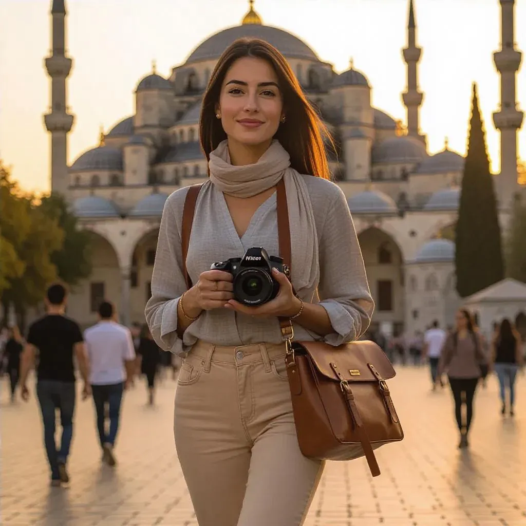 Capture Sofia's sunset stroll by Istanbul's Blue Mosque with AI-generated visuals. Perfect for travel blogs, photography portfolios, or fashion inspiration. Create vivid scenes featuring Nikon cameras, chic beige jeans, linen blouses, and vintage leather bags using advanced AI tools. Ideal for sunset backdrops, cultural content, and stylish travel imagery.