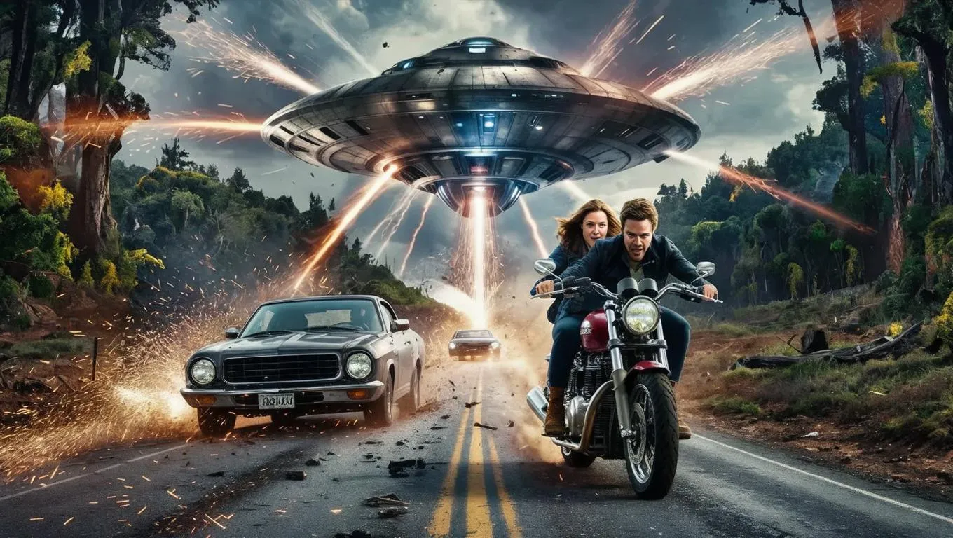 Experience an AI-generated sci-fi masterpiece: hyper-realistic alien spacecraft obliterates vehicles with pulsating beams as a terrified motorcycle couple escapes into a mystical forest. Vibrant foliage clashes with metallic menace, capturing chaotic urgency in dynamic digital art. Ideal for futuristic storytelling, action scene visuals, and AI-powered creative inspiration.