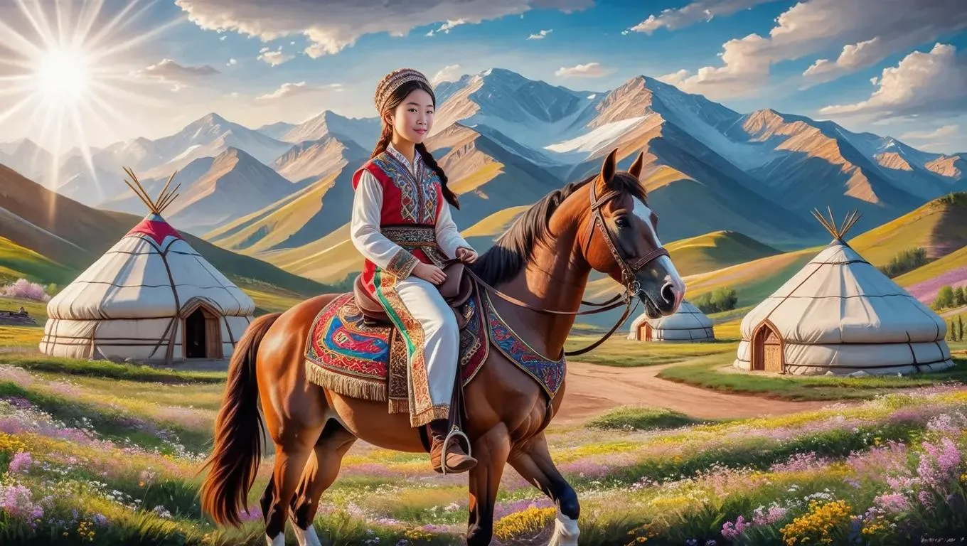 Create a vibrant AI-generated ethnographic Kyrgyz poster: elechek-clad girl on horseback amid mountains, yurts, and blooming fields. Blends traditional patterns, vivid colors, and modern aesthetics for a powerful cultural-nature fusion. Perfect for heritage-inspired visual storytelling with detailed compositions and warm, inviting atmospheres.