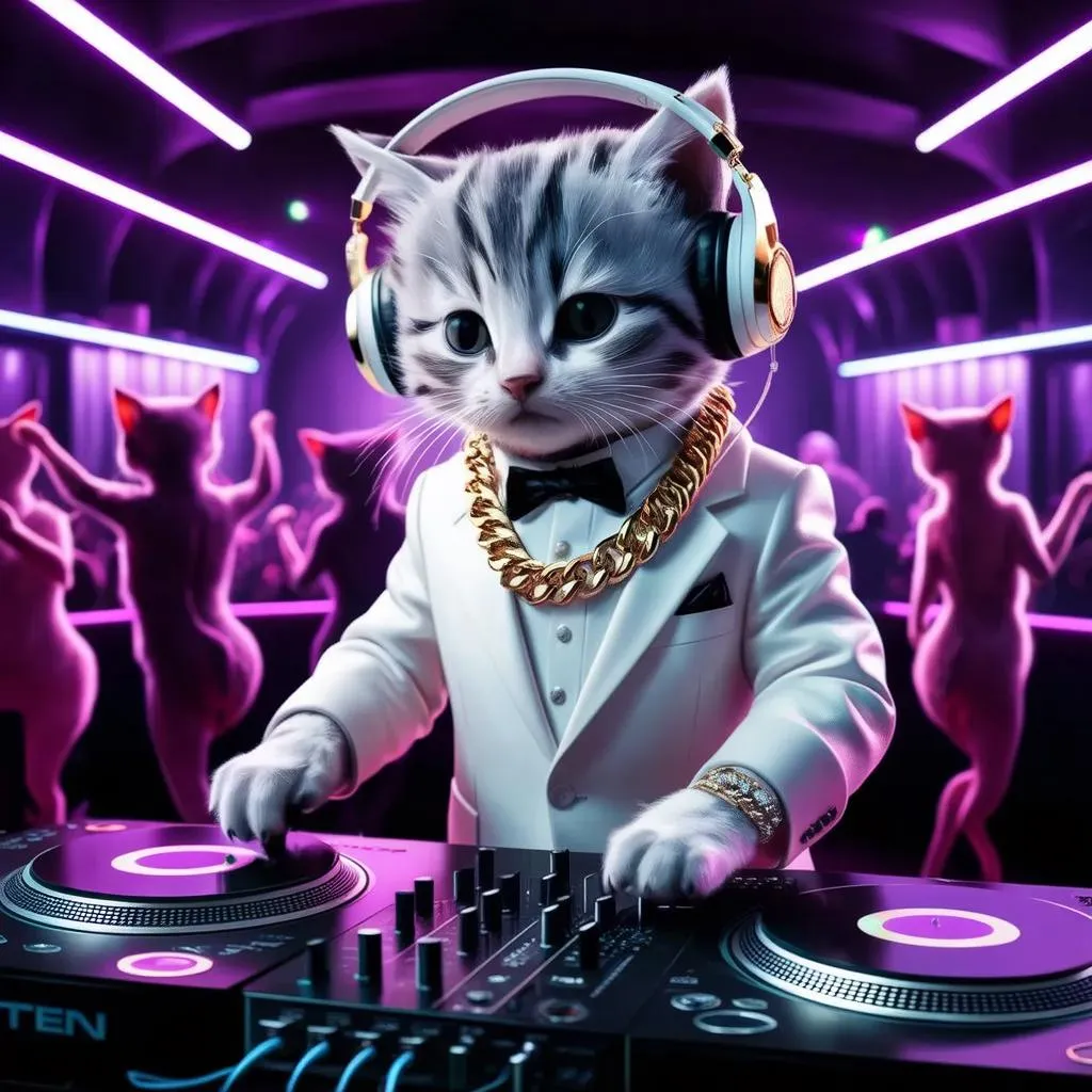 Hyper-realistic 16K render of a fashionable DJ kitten mixing house music in a luxury underground nightclub. Features ray tracing, neon lights, bold colors, and intricate details like a white suit, gold chain, and rainbow halo. Dynamic party atmosphere with dancing kittens, purple lasers, and hyperrealism for super clarity. Perfect blend of music, fashion, and after-hours energy. #RayTracing #Hyperrealism #NeonLights
