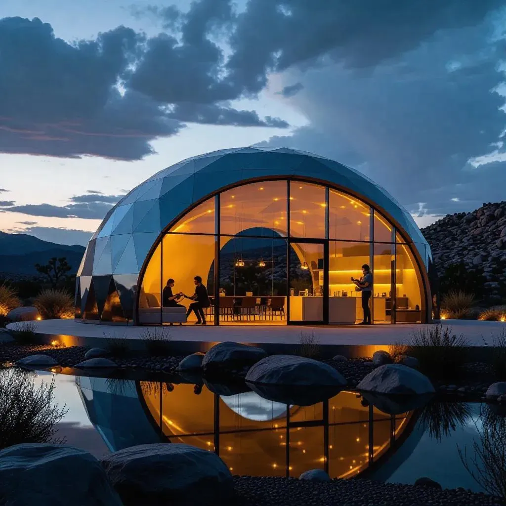 Create AI-generated futuristic architecture with vivago.ai. Design modern dome buildings featuring smooth metal panels, panoramic windows, and warm integrated lighting. Generate cozy interiors with people cooking, reading, and playing instruments. Visualize dramatic nighttime landscapes with rocky terrain, reflective ponds, and starry skies. Transform text prompts into professional visuals.