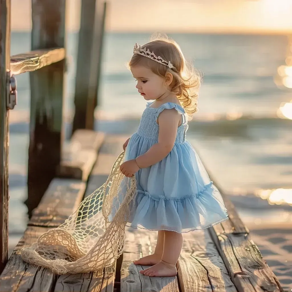 Capture childhood innocence with AI-generated visuals of a blonde toddler in a blue dress and tiara, exploring a sunlit wooden dock with a fishing net. Golden hour warmth, soft focus, and coastal charm evoke nostalgic summer moments. Perfect for storytelling with detailed textures and shallow depth of field.
