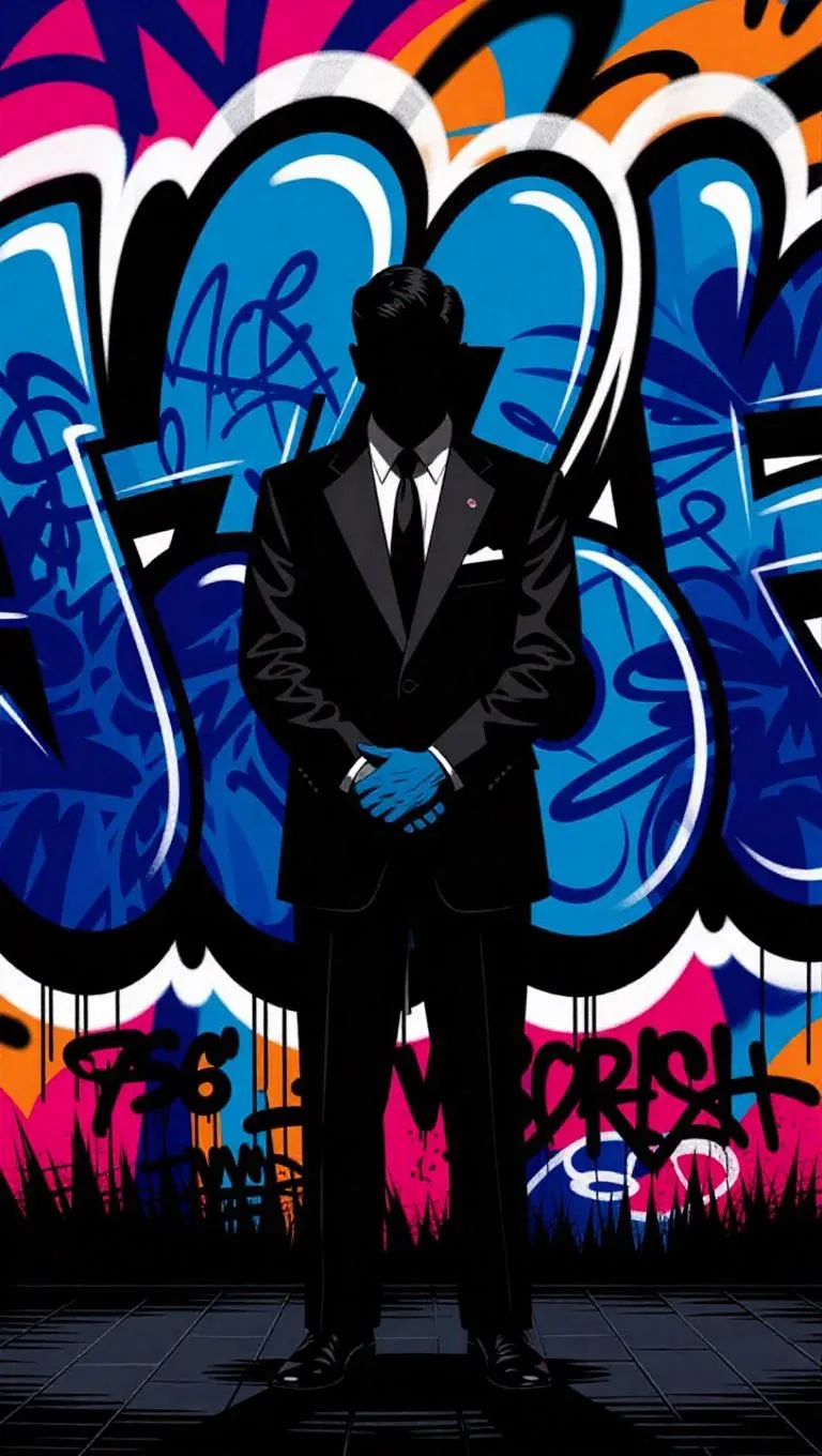 Step into a noir-inspired world with this AI-generated 1960s silhouette artwork. Featuring a mysterious suited figure against vibrant graffiti, this digital illustration blends retro aesthetics with edgy urban vibes for captivating, moody visuals. Perfect for vintage-inspired storytelling or retro-themed branding.