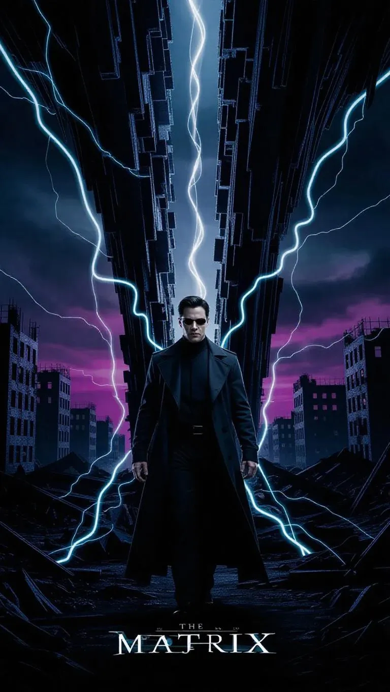 Neo from "The Matrix" stands in front of a vast, eerie dimensional rift. Chaotic energy lines and distorted light and shadow gush from the cracks, connecting different times and spaces. Neo wears his trademark black trench coat, eyes firm, surrounded by a faint blue energy echoing the rift's energy. The ruins of an abandoned city, with buildings distorted like melted wax, create a surreal backdrop. Thick CG style, ultra-high definition, cold tones of blue and purple, strong lighting from the rift, sharp contrast, Neo centered, dimensional cracks dominating, smooth trench coat, dilapidated city, flowing energy lines.