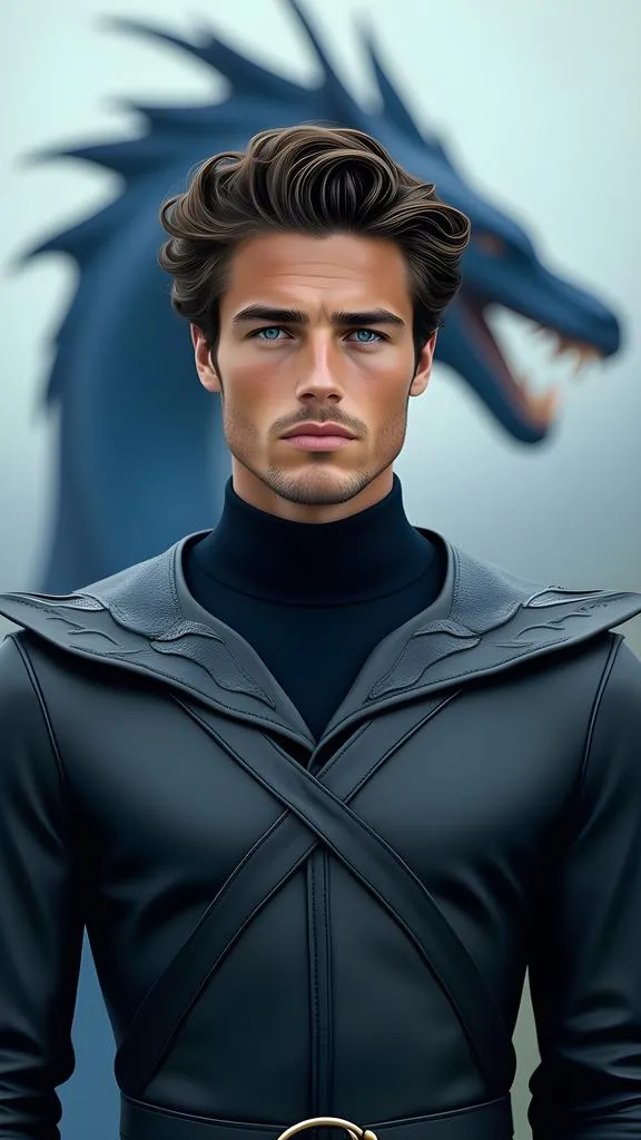 A young man stood confidently in front of a huge blue dragon. He was wearing a black leather jacket with a high collar and a belt tied around his waist. His hair was combed in a swept back style, and his gaze turned to one side with a serious expression on his face. The dragon behind him is impressive, with large wings spread out, seeming to roar or spew smoke.