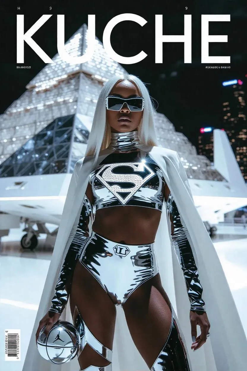 Craft a striking KUECHE magazine cover with Sanaa Lathan in heroic pose: futuristic Egyptian pyramid, cyberpunk jet, neon-lit chrome Superman suit, Jumpman 23 icon, and glass basketball. AI-powered cinematic black-and-white visuals blend cybernetic elements, high contrast, moon setting, and fractal sun. Elevate designs with sharp lines, dynamic angles, and neon reflections for a dramatic, ultra-modern editorial masterpiece.