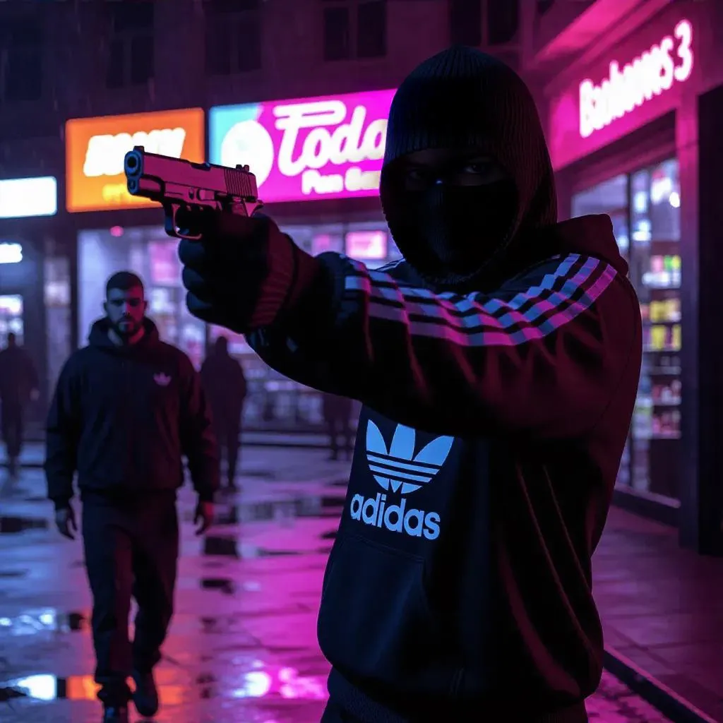 Create AI-generated digital art with GTA5-style graphics. Depict a youth in a balaclava, Adidas tracksuit, wielding a pistol toward a fearful civilian near a shop. Poster-like visuals, cinematic intensity, and dynamic angles. Explore AI image generation on Vivago.ai for bold, action-packed scenes blending realism and game-inspired art. Perfect for edgy storytelling or urban-themed projects.