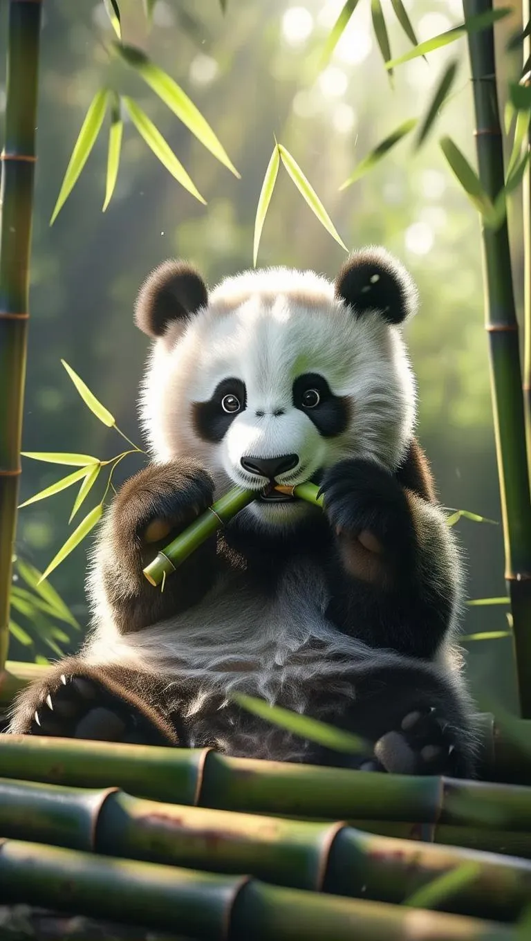 Generate a lifelike HD image of a cute panda eating bamboo, crafted with AI technology. Experience ultra-realistic fur textures, vibrant green surroundings, and intricate details for stunning visuals. Perfect for nature lovers and digital art projects. Explore vivago.ai's AI tools for professional-grade, realistic animal imagery.